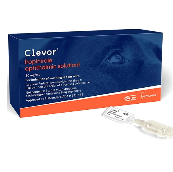 Orion brand Clevor (ropinirole) is used when a veterinarian deems it appropriate to induce vomiting in a dog, to remove something the dog has ingested, such as a foreign object, or a potentially harmful substance. Stimulates the vomiting center in the brain, triggering the process. Administered as eye drops. An EU Authorised medicine.