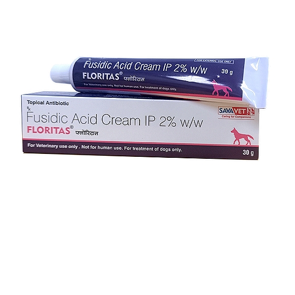 FLORITAS Cream contains Fusidic acid, an anitbotic which is used in the treatment of bacterial skin infections such as surface & superficial canine pyoderma, impetigo and infected dermatitis.