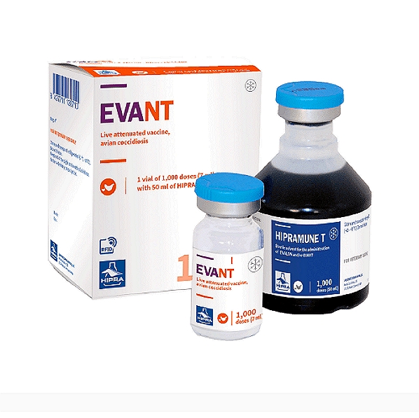 EVANT (coccidiosis vaccine (live)) is used to protect chickens against coccidiosis, a parasitic disease of the gut. Protection established within two weeks lasts for at least 63 days. Helps reduce the severity of the disease, and the number of disease-causing spores (oocysts) shed in the chicken's feces.