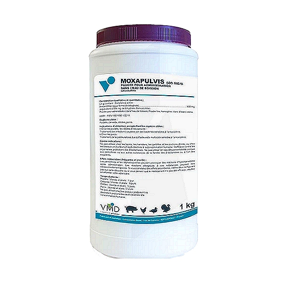 VMD brand MOXAPULVIS 500 (amoxicillin trihydrate) is used to treat bacterial infections in chickens, turkeys, ducks, and pigs caused by bacteria susceptible to amoxicillin. In pigs, it's used to control pasteurellosis. Administered in drinking water. An EU Authorised medicine.