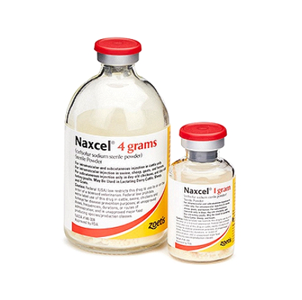 Naxcel (ceftiofur) is a broad-spectrum antibiotic used in veterinary medicine to treat various bacterial infections in multiple animal species. Commonly used to treat respiratory diseases in cattle, swine, and horses, for foot rot in cattle, and certain infections in sheep, goats, and poultry.