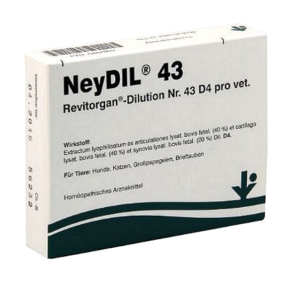 vitOrgan brand Neydil 43 is a veterinary medicine used to support the musculoskeletal system in animals. It's designed to regulate physiological processes that are out of balance. Contains Articulationes bovis fetalis D4 aquos, Cartilago bovis fetalis D4 aquos, and Synovia bovis fetalis D4 aquos. An EU Authorised medicine.