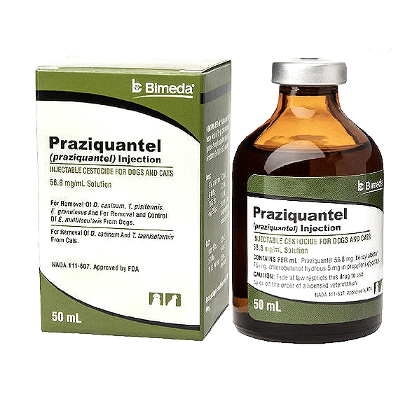 Praziquantel is a clear solution containing 56.8 milligrams of praziquantel per mL which has been formulated for subcutaneous or intramuscular use in dogs and cats for the removal of cestodes (tapeworms).