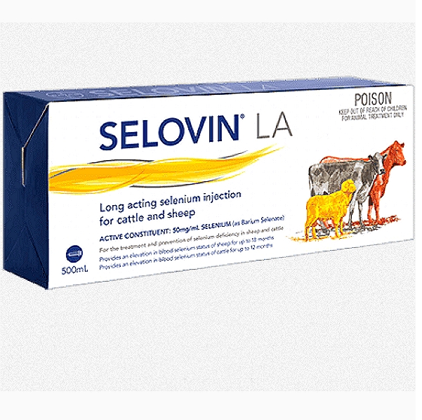 Selenium Injection is a long-acting selenium supplementation for cattle and sheep. Selenium is a trace element that is vital for normal metabolism; it is an essential antioxidant that prevents and repairs cell damage, and plays a role in muscle and immune function, and the synthesis of thyroid hormones. Selovin LA works to elevate selenium blood and tissue levels in deficient states.