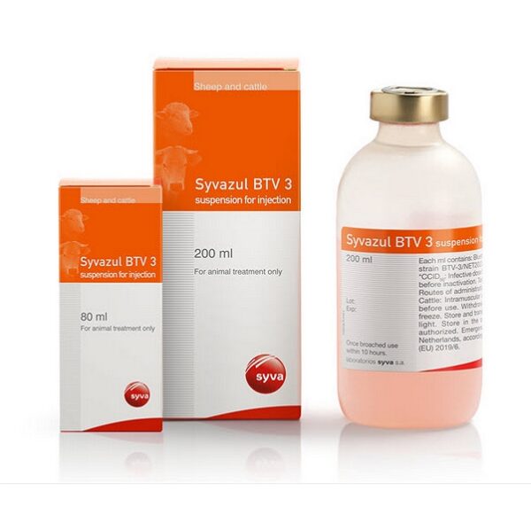 SYVA brand Syvazul BTV 3 (bluetongue virus vaccine (inactivated)) is used for the active immunization of sheep and cattle to combat Bluetongue Virus (BTV), specifically serotype 3 (BTV-3). Reduces viraemia, lesions, mortality and clinical signs. Prevents death and lessens the severity of symptoms in sheep and cattle. An EU Authorised medicine.